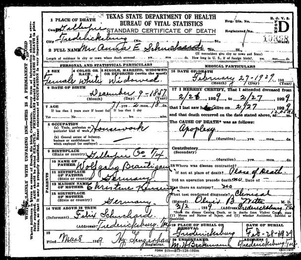 Died February 27, 1929 in Fredericksburg, Gilliespie County, Texas