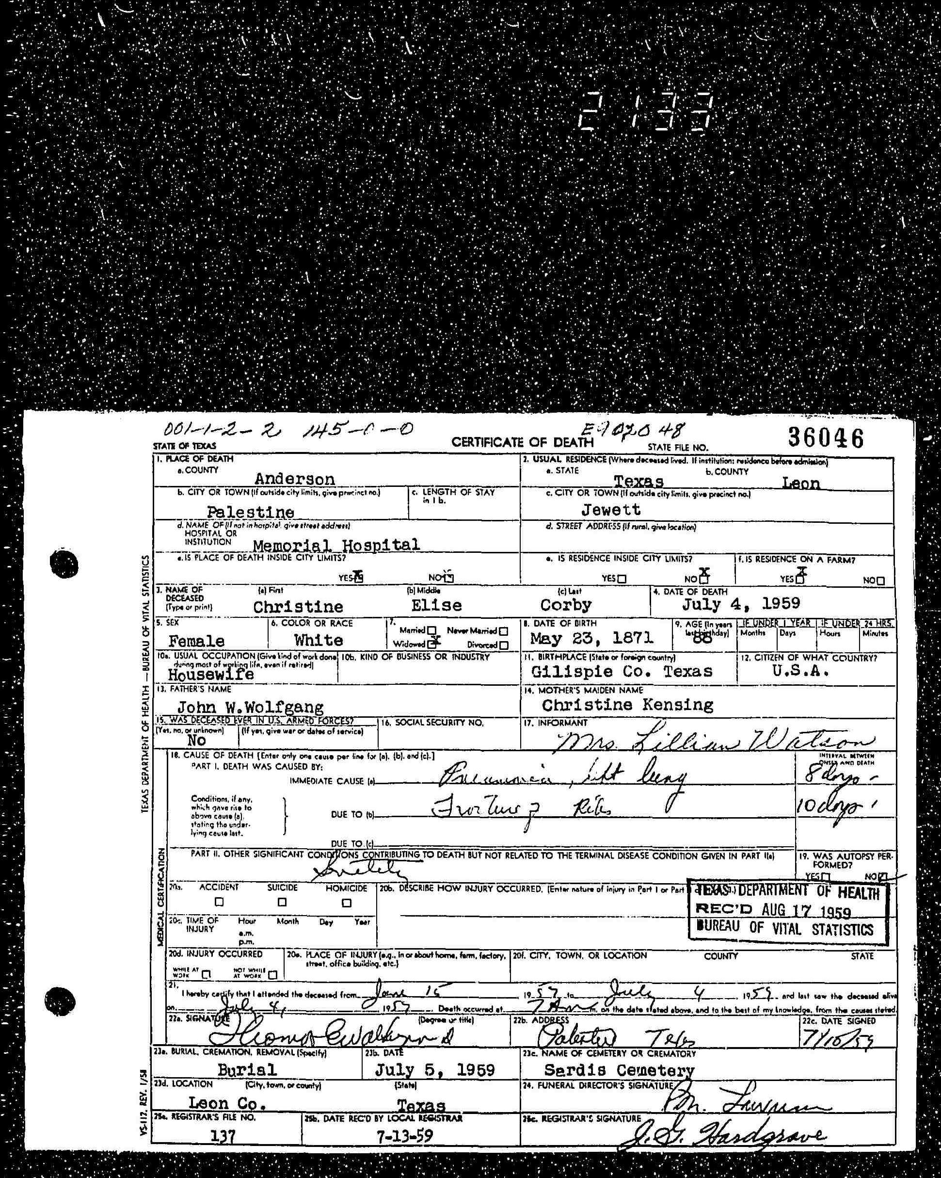 Christine Elise Corby certificate of death 4 Jul 1959