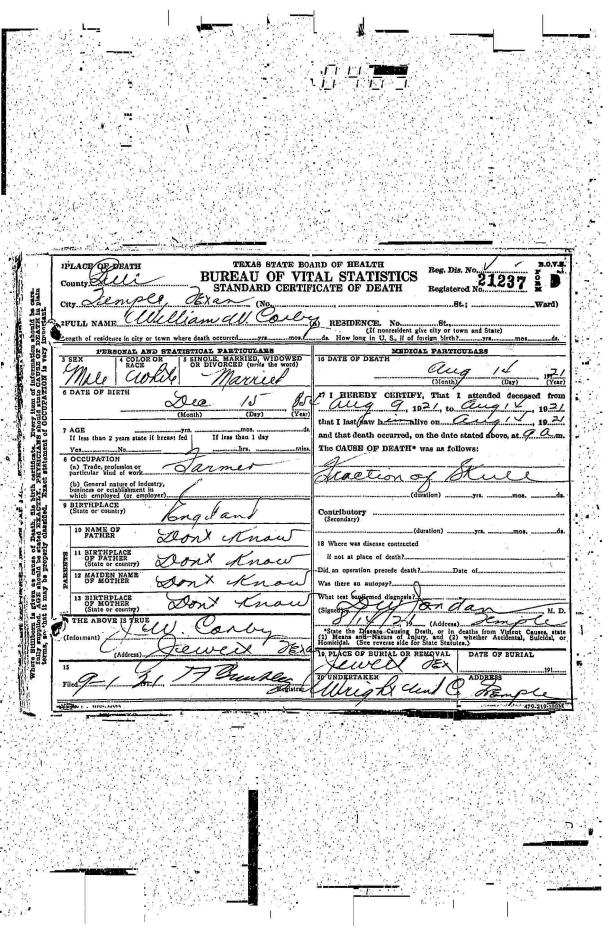 William Witty Corby certificate of death 14 Aug 1921