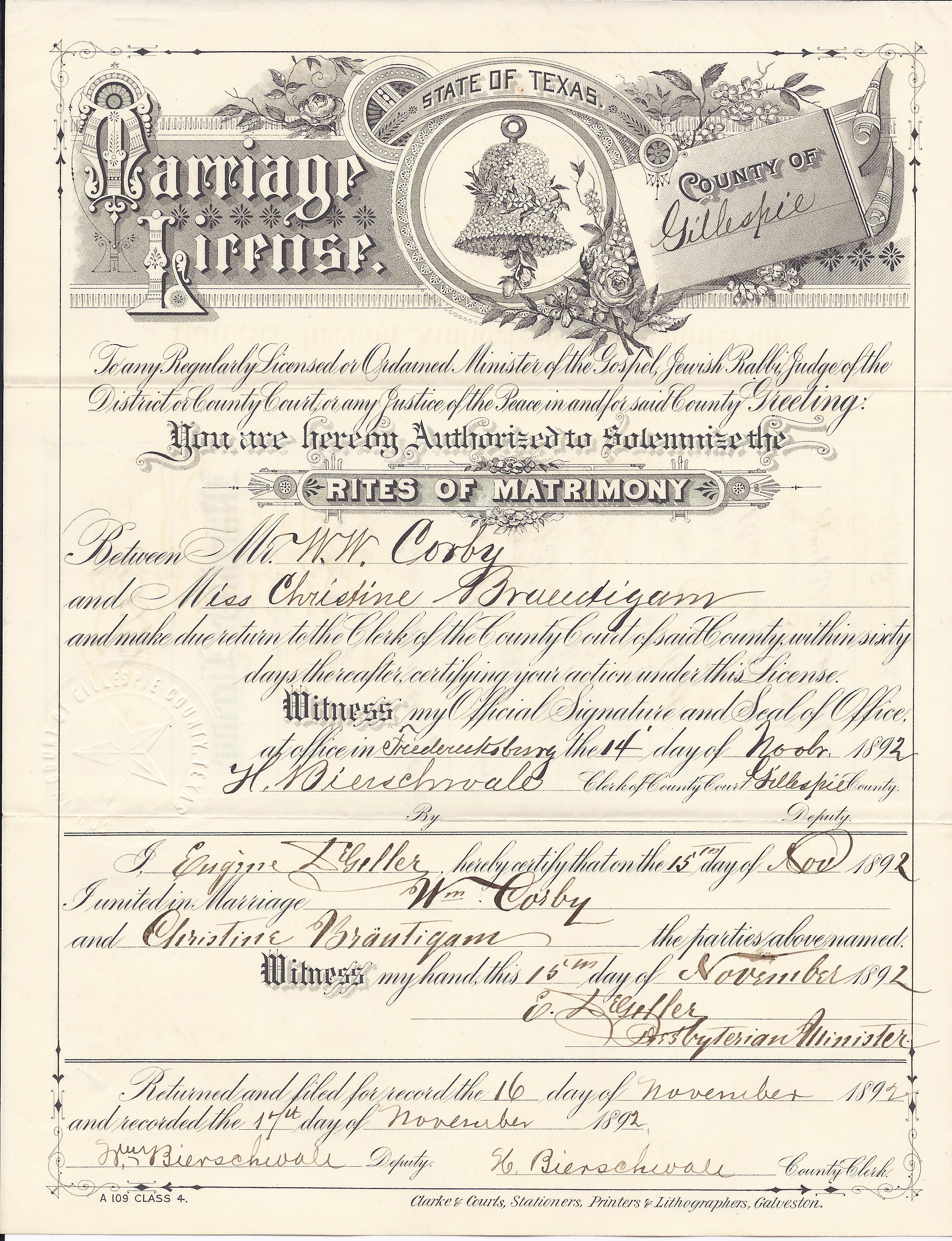 William and Christine Corby marriage license 15 Nov 1892
