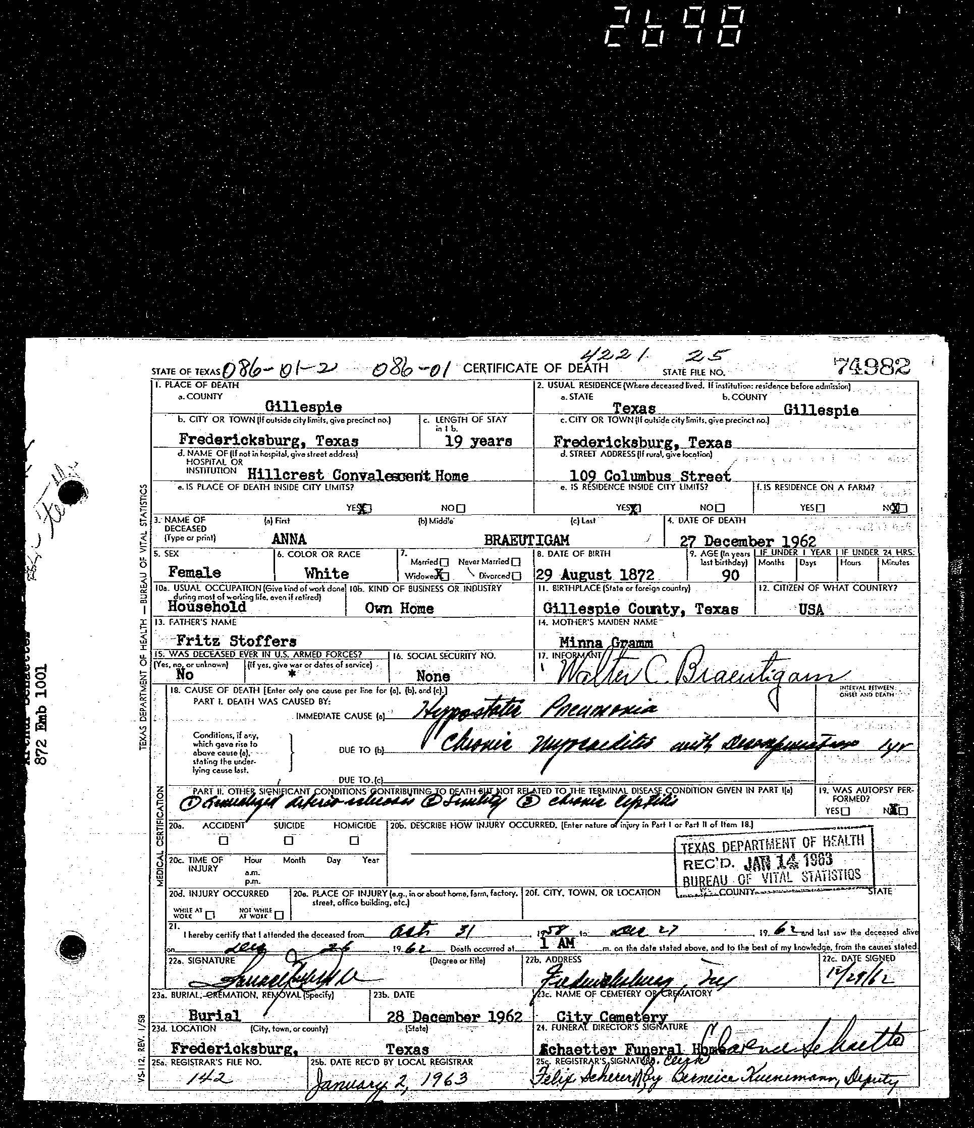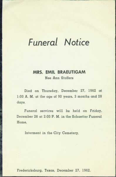 Died December 27, 1962 in Fredericksburg, Gillespie County, Texas