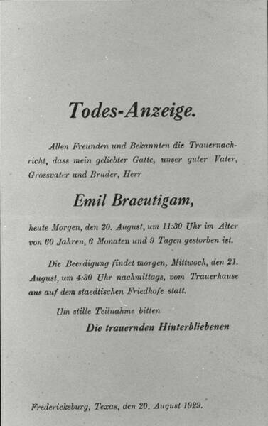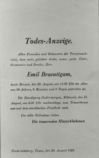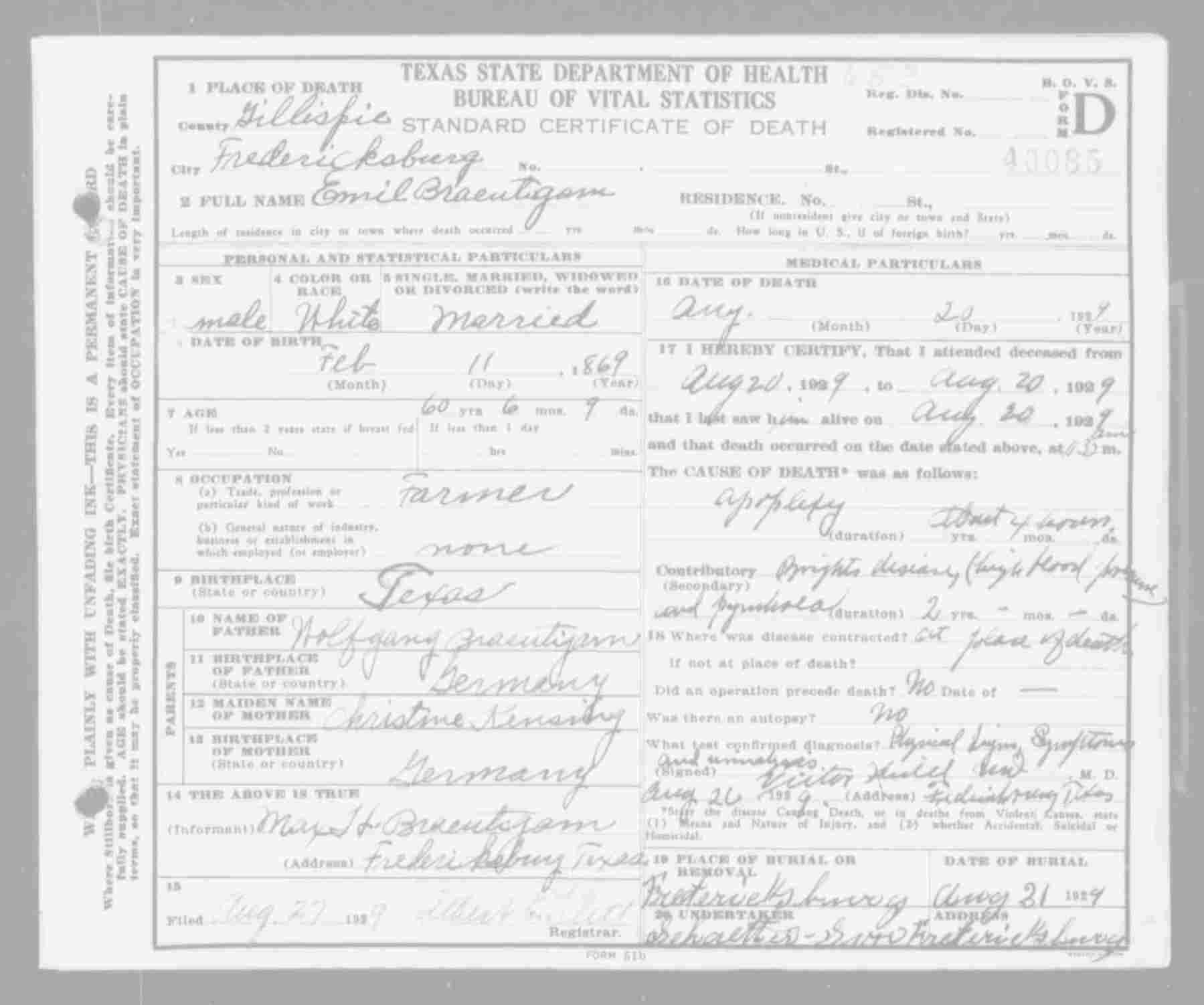 Died August 20, 1929 in Fredericksburg, Gilliespie County, Texas