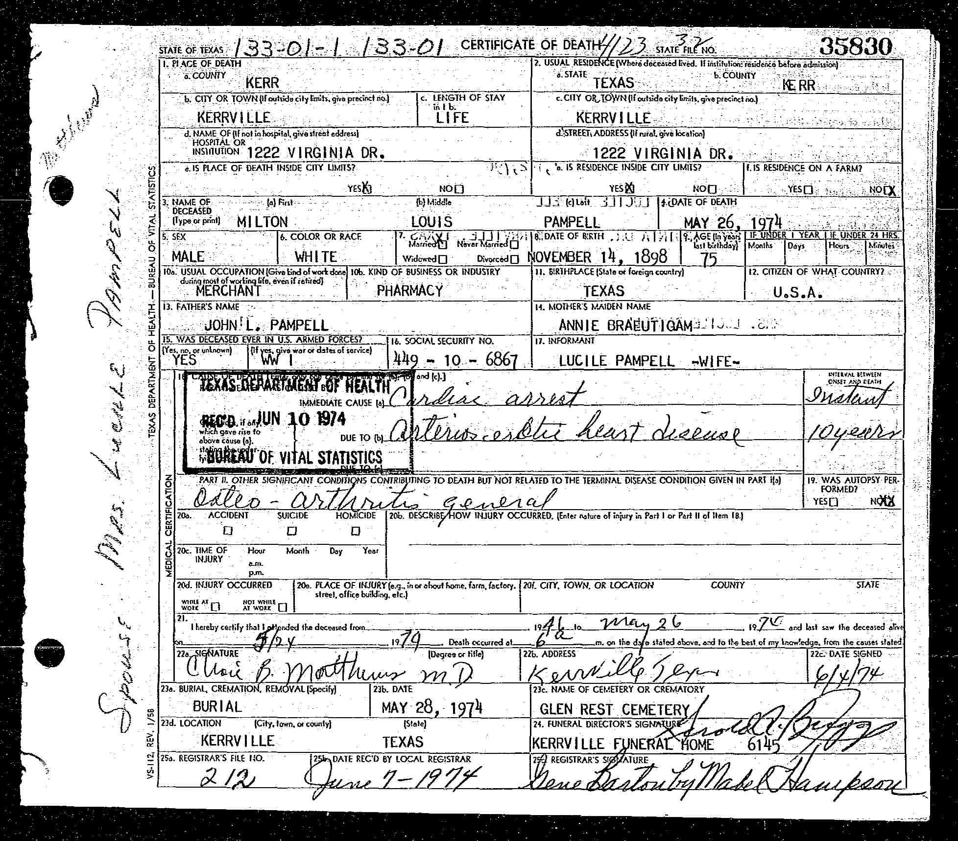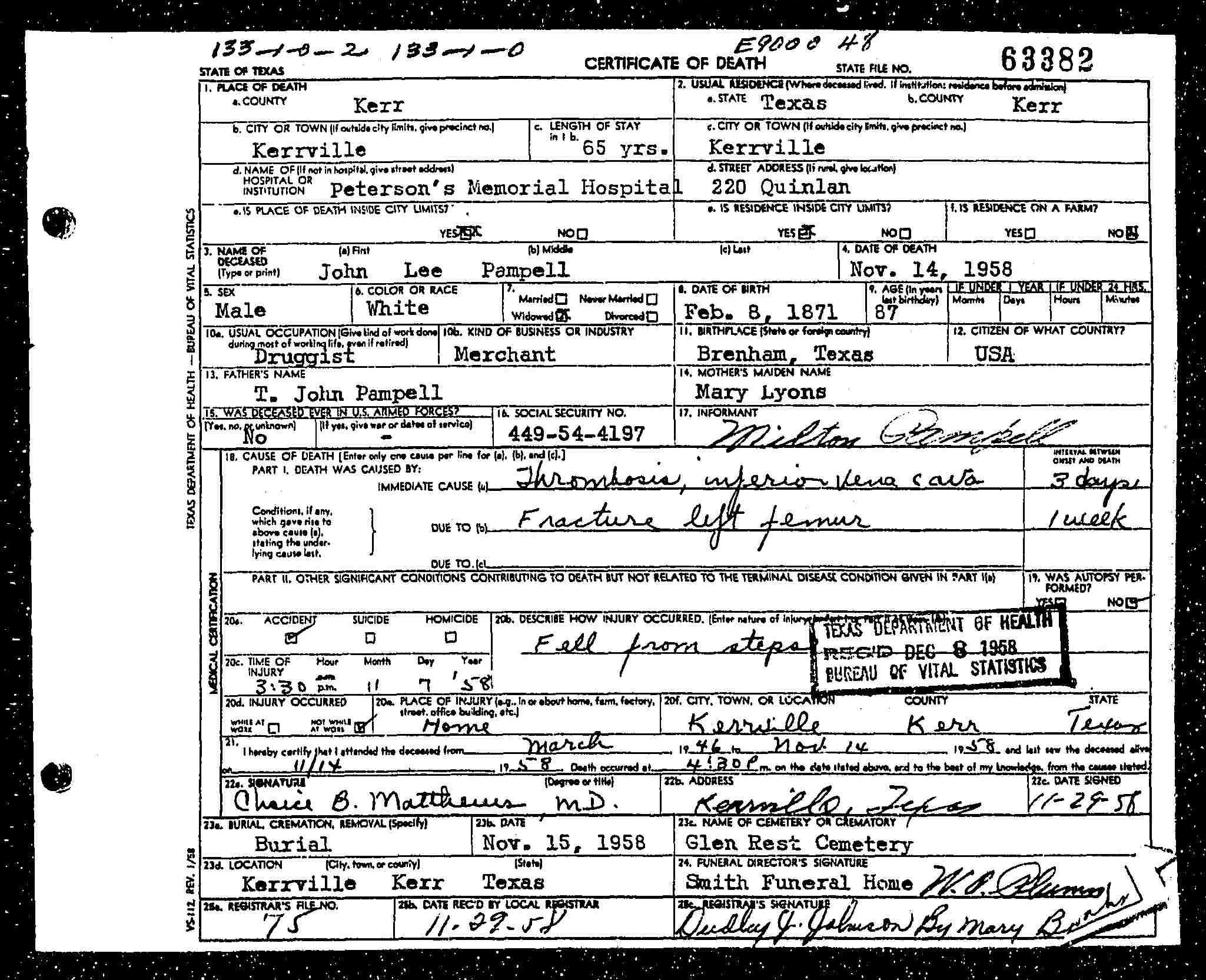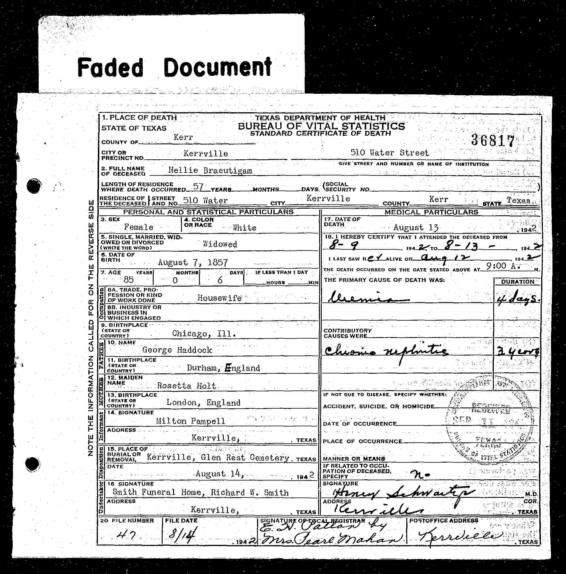 Died August 13, 1942 in Kerrville, Kerr County, Texas