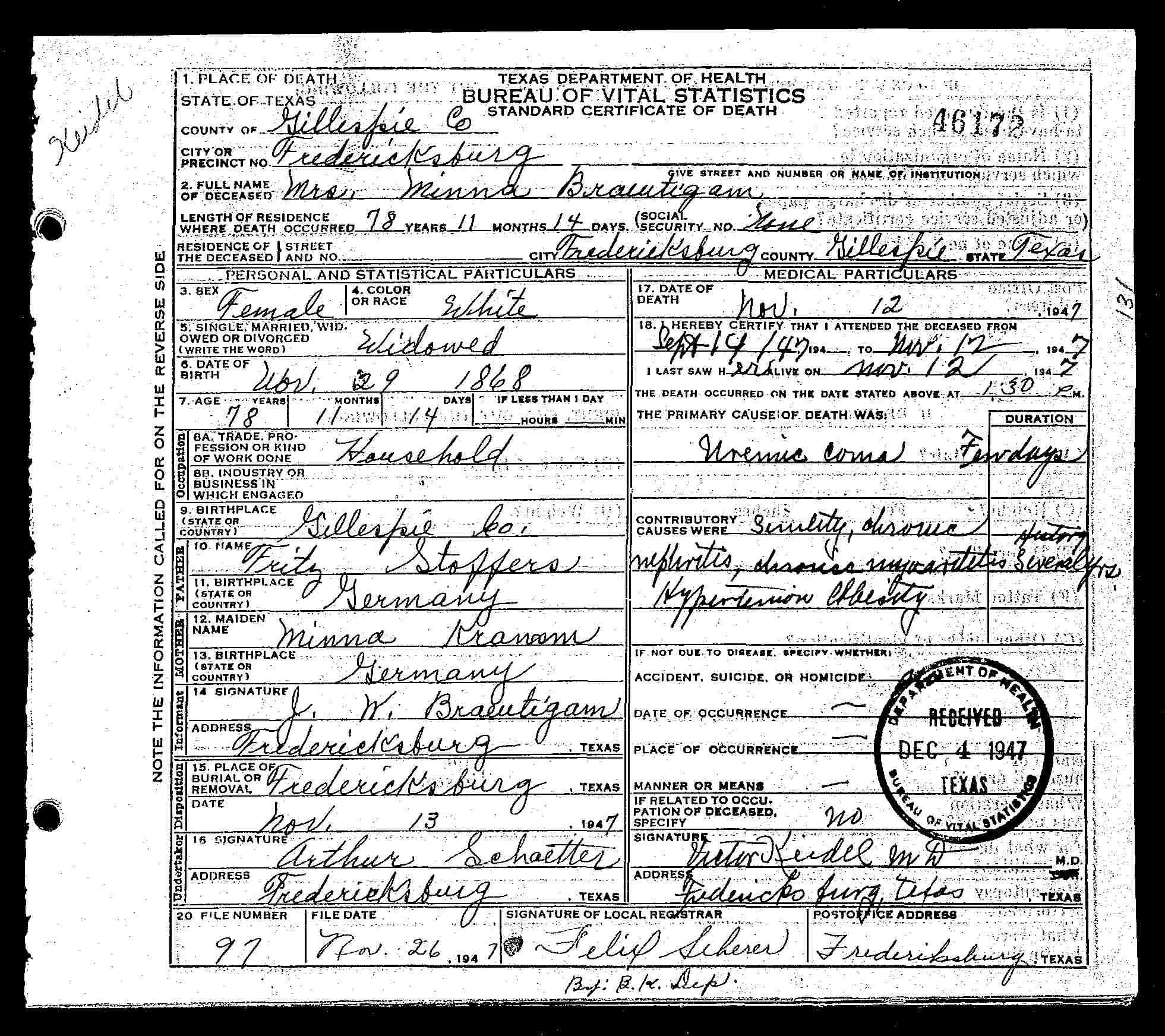 Died November 12, 1947 in Fredericksburg, Gillespie County, Texas