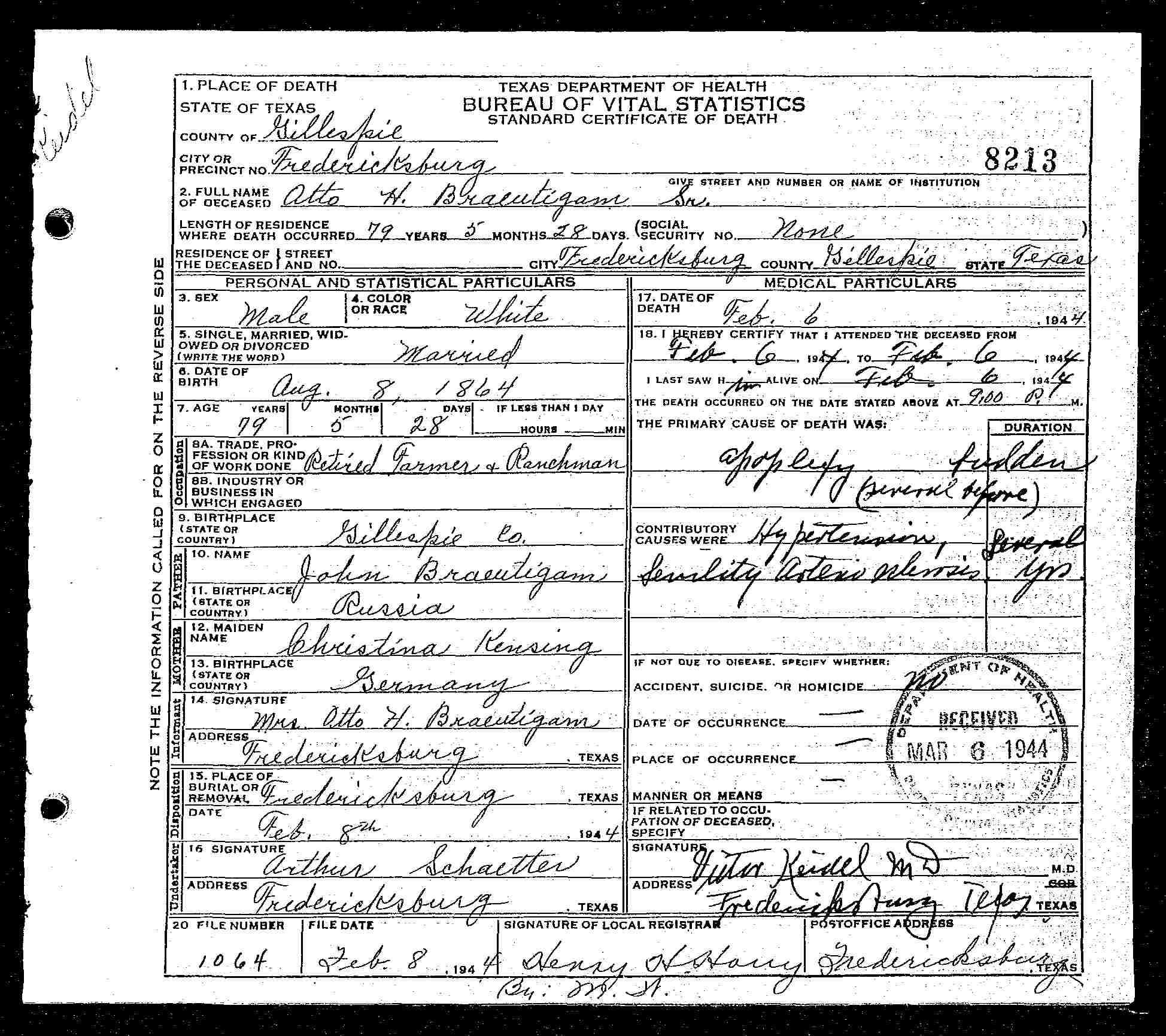 Died February 6, 1944 in Fredericksburg, Gilliespie County, Texas