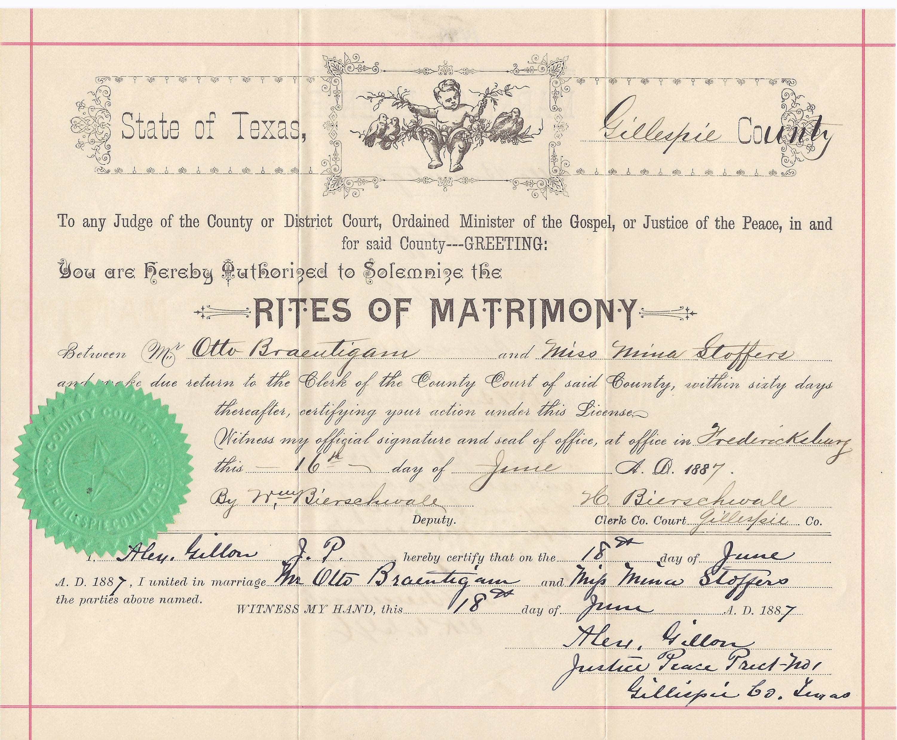 Otto and Minna Braeutigam marriage license 18 Jun 1887
