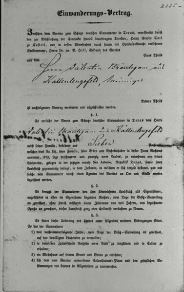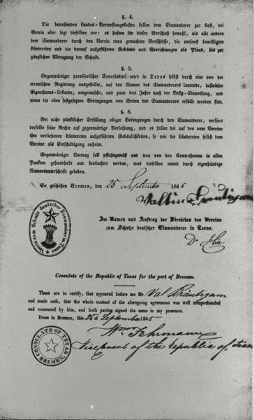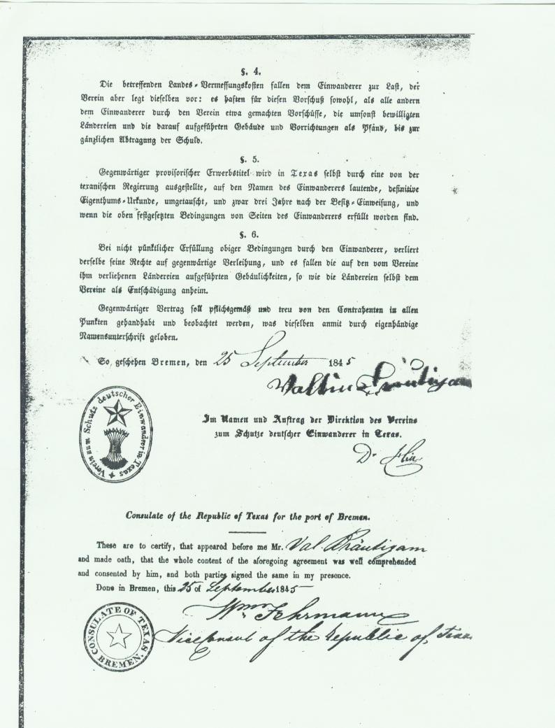 Front page of Vereins contract signed by Johann Valentin Braeutigam with the Republic of Texas - 1845