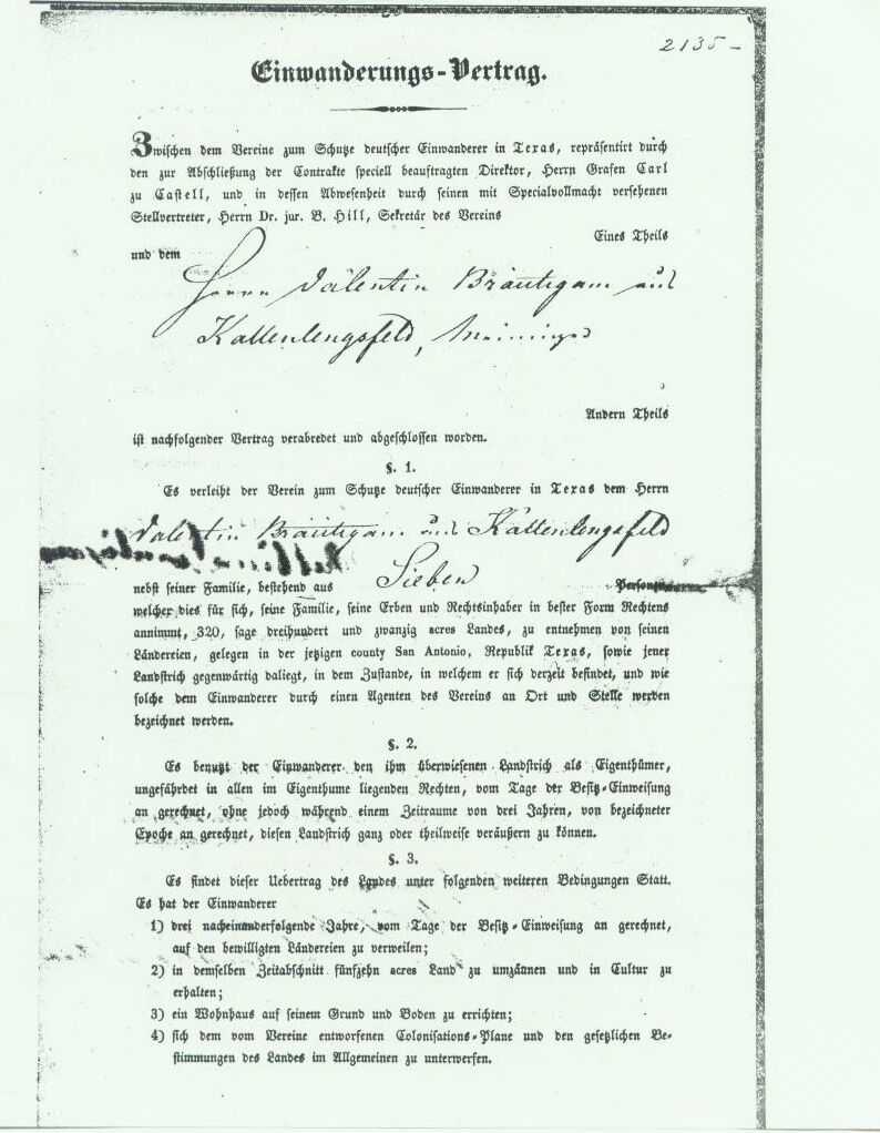 Johann Valentin Braeutigam and his family made the decision to leave Kaltenlengsfeld, Germany for the Republic of Texas in 1845. Johann and his family departed Bremen, Germany in September 1845 aboard the ship Johann Dethardt. They arrived at Indianola, Texas in December 1845.